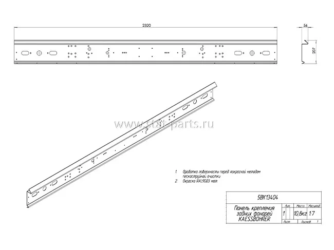 Панель крепления задних фонарей Kassbohrer, 5BK13404 выполнена из высокопрочной стали. Профиль устойчив к коррозии, выдерживает значительные вибрационные и механические нагрузки. В конструкции предусмотрены все необходимые отверстия для монтажа задних фонарей. Панель устанавливается на раму с помощью кронштейнов.
