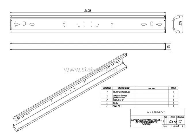 Купить БАМПЕР ЗАДНИЙ ПОЛУПРИЦЕПА C ЗАГЛУШКАМИ UNIVERSAL L=2400ММ (арт.TL5380561350) в интернет-магазине «СТАТ» по доступной цене. Доступна доставка по Москве и России и самовывоз. На странице представлена информация о запчасти:- подробное описание,