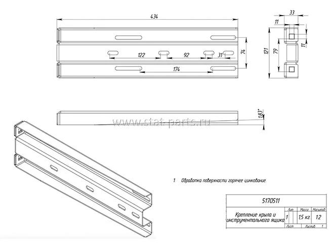 Крепление крыла и инструментального ящика, 5170511 выполнено из качественной стали. Оцинковка обеспечивает надежную защиту металла от коррозии. Деталь выдерживает значительные динамические и механические нагрузки. В конструкции предусмотрены специальные отверстия для монтажа крепления к раме грузового автомобиля.