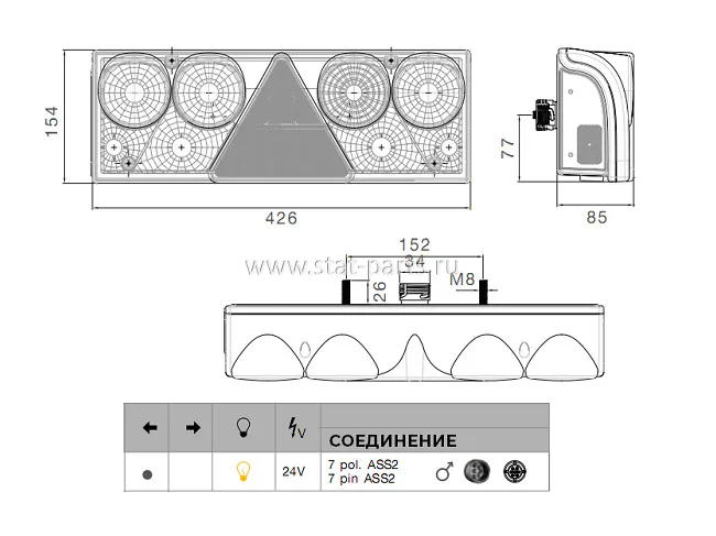 Фонарь задний левый EUROPOINT II Schmitz 1098647, 25-6000-501 состоит из указателя поворота, фонаря заднего габаритного света, стоп-сигнала, противотуманной фары, сигнала заднего хода, треугольного отражателя и бокового габаритного фонаря. Напряжение системы составляет 24 В. Ударопрочный корпус имеет класс защиты IP54. Светотехника Aspoeck устойчива к провалам и перегрузкам, возникающим в системе электропитания.