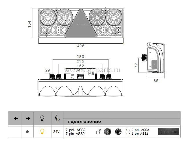 Фонарь задний правый EUROPOINT II Schmitz 1098646, 25-6600-501 состоит из указателя поворота, габаритных огней, стоп-сигнала, противотуманной фары, сигнала заднего хода, треугольного отражателя и бокового габаритного фонаря. Напряжение системы составляет 24 В. Ударопрочный корпус имеет класс защиты IP54. Световое оборудование австрийского концерна Aspoeck рассчитано на эксплуатацию в экстремальных условиях. Обязательное тестирование в испытательных лабораториях является гарантией качества продукции бренда.